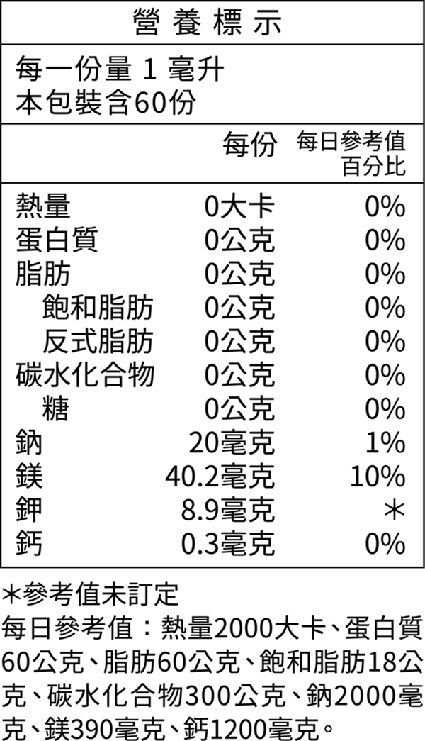 含鎂、鉀、鈣等,具營養性,多種天然離子態礦物質與微量元素,擁有三項製程與功效專利,可迅速被人體吸收利用。