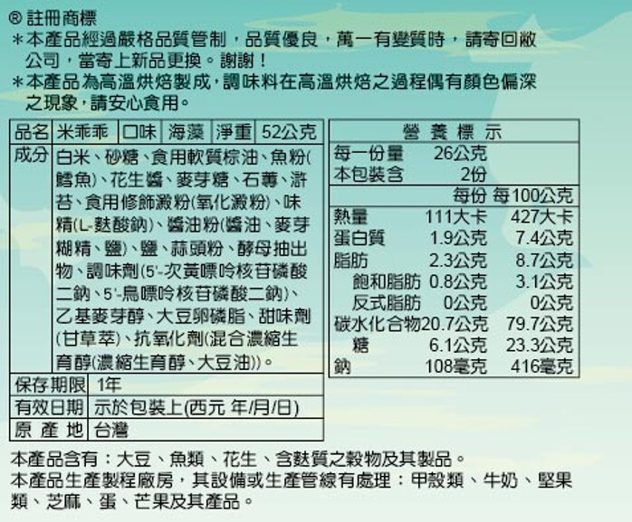1. 本產品含有:大豆、魚類、花生、含麩質之穀物及其製品。