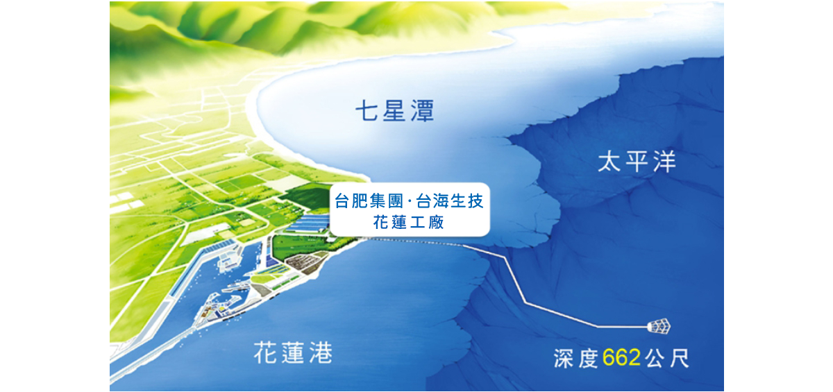 「台灣海洋深層水股份有限公司」位於台灣花蓮市美崙「台肥海洋深層水園區」內,取水管線佈於花蓮七星潭海灣風景南岸,為全台灣唯一全年穩定供應深層海水之生產基地,深度達海平面下662公尺,取水管總長4950公尺,取水管路示意圖如下: